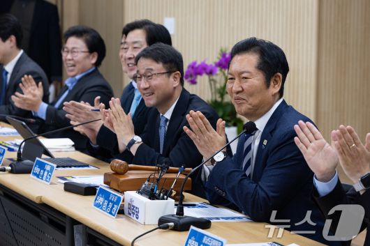 (서산=뉴스1) 유승관 기자 = 정청래 더불어민주당 대표를 비롯한 지도부가 14일 충남 서산시 서산축산종합센터에서 열린 충남 민생 현장 최고위원회의에서 손뼉을 치고 있다. 2026.1.14/뉴스1fotogyoo@news1.krCopyright ⓒ 뉴스1. All rights reserved. 무단 전재 및 재배포, AI학습 이용 금지.