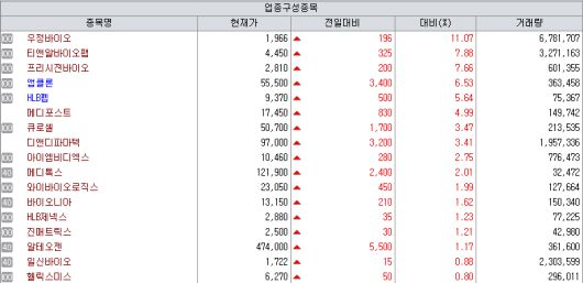 6일 제약바이오 업종 시세. (제공=KG제로인 엠피닥터) |