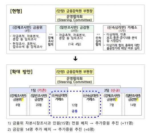 현재 합동대응단은 강제조사반(금융위)·일반조사반(금감원)·신속심리반(거래소)으로 구성된 3반 1팀 체제로 운영되고 있다. 개편 이후에는 강제조사반과 일반조사반을 각각 1개씩 신설해, '강제조사반-일반조사반-신속심리반' 구성의 2개 팀을 운용하게 된다.