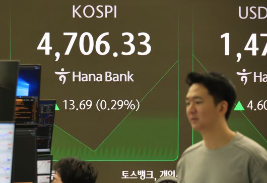 14일 서울 중구 하나은행 본점 딜링룸에서 직원이 증시와 환율을 모니터하고 있다. 코스피는 7.53p(0.16%) 내린 4,685.11로 개장해 상승전환, 장중 사상 첫 4700선을 돌파했다. [연합] |