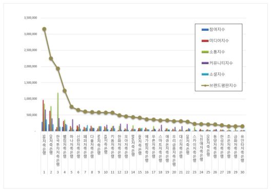 브랜드평판지수는 브랜드 빅데이터를 기반으로 브랜드에 대한 긍부정 평가, 미디어 관심도, 소비자의 참여와 소통량, 소셜 대화량, 커뮤니티 확산도를 종합해 산출된다. 여기에 브랜드 영향력을 측정하는 브랜드 가치평가 분석과 ESG 평가 데이터도 포함됐다.