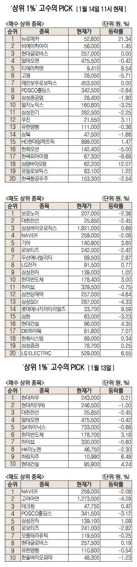 미래에셋증권은 자사 고객 중에서 지난 1개월간 수익률 상위 1% 투자자들의 매매 종목을 집계해 실시간·전일·최근 5일 기준으로 모바일트레이딩시스템(MTS) 상에서 공개하고 있다. 이 통계 데이터는 미래에셋증권의 의견과 무관한 단순 정보 안내이며 각각의 투자자 개인에게 맞는 투자 또는 수익 달성을 보장하지 않는다. 또 테마주 관련종목은 이상 급등락 가능성이 있으므로 유의해야 한다.