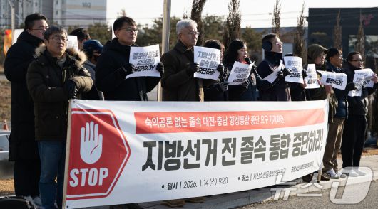 (서산=뉴스1) 유승관 기자 = 충남시민사회단체연대회의가 14일 더불어민주당 민생 현장 최고위원회가 열리는 충남 서산시 서산축산종합센터 앞에서 숙의공론 없는 졸속 대전·충남 행정통합 중단 요구 기자회견을 하고 있다. 2026.1.14/뉴스1