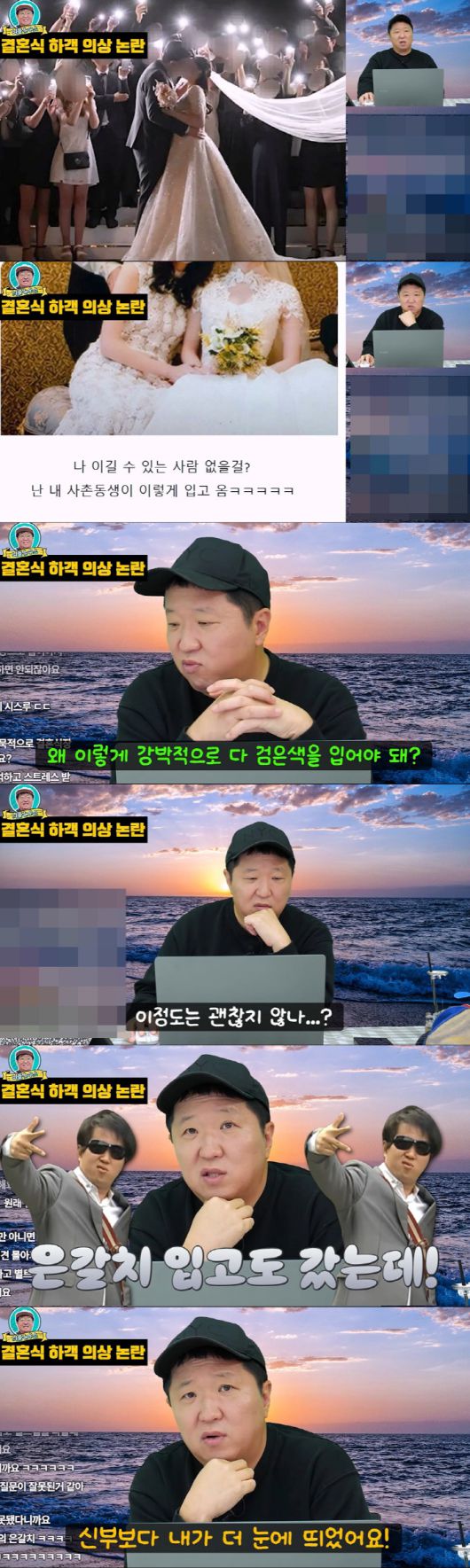 팬들과 라이브 소통을 하던 정형돈은 '민폐 하객룩'에 대한 커뮤니티 글을 읽었다. 글쓴이의 결혼식에 신랑 측 하객이 하얀색 원피스를 입고 맨 앞에서 사진을 찍었다는 것. 해당 글 댓글에는 "나 이길 수 있는 사람 없다. 내 사촌 동생이 이렇게 입고 옴"이라며 또 다른 흰색 드레스 사진이 담겼다. 이를 본 정형돈은 "이건 선 넘었다. 드레스 같아서 신부가 누구인지 헷갈릴 수 있는 의상이지 않냐"면서도 "근데 이게(첫 번째 사진) 웨딩드레스랑 구분을 못할 정도인가 싶다. 물론 신부가 가장 빛나야 되는 순간은 맞지만 왜 이렇게 강박적으로 다 검은색을 입어야 하는 생각도 있다. 언젠가부터는 장례식 같다"고 토로했다.