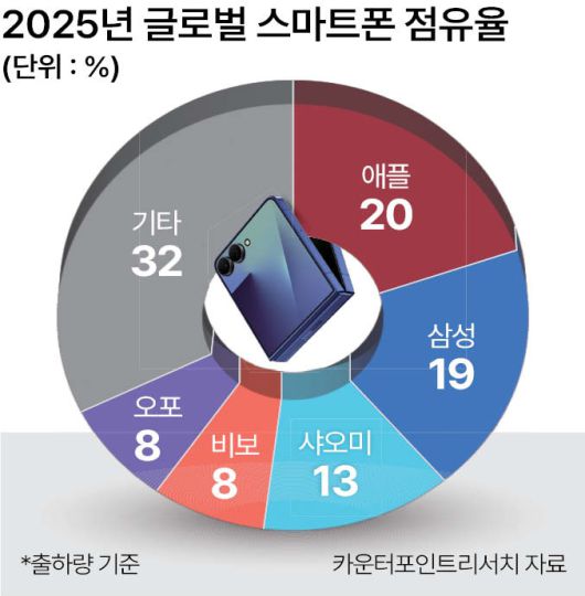애플은 20%의 점유율을 차지하며 삼성전자를 제치고 연간 출하량 1위에 올랐다. 삼성전자는 19%의 점유율로 2위로 밀려났다. 3위는 샤오미(13%)였고, 4위와 5위에는 각각 8% 대의 점유율을 기록한 중국의 비보와 오포다. 특히 샤오미는 프리미엄화 전략과 신흥 시장에서의 견조한 수요를 바탕으로 안정적인 실적을 이어갔고, 비보 역시 인도 등 오프라인 시장에서의 선전으로 상위권에 안착했다.