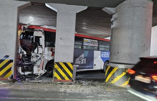 [수원=뉴시스] 13일 오후 5시35분께 경기 수원시 권선구 세류동의 한 도로를 달리던 버스가 지하차도 기둥을 들이받았다. (사진=경기도소방재난본부 제공) 2026.01.14. photo@newsis.com *재판매 및 DB 금지 |