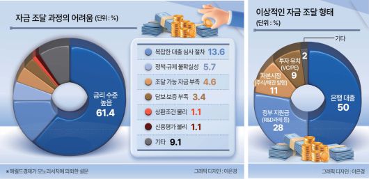 14일 헤럴드경제가 모노리서치에 의뢰해 국내 매출 상위 1000대 기업을 대상으로 ‘기업이 바라는 생산적 금융 설문조사’를 진행한 결과, 자금 조달 과정에서 겪은 가장 큰 어려움에 대한 응답 중 ‘금리 수준 높음’이 61.4%로 가장 큰 비중을 차지했다.