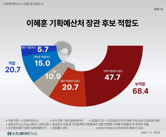14일 여론조사 업체 조원씨앤아이가 스트레이트뉴스 의뢰로 지난 10~12일 사흘간 전국 만 18세 이상 남녀 2001명을 대상으로 진행한 조사 결과, 이 후보자가 장관으로 '적합하지 않다'는 응답은 68.4%로 집계됐다. '적합하다'는 응답은 20.7%에 그쳤고 '잘모름'은 10.9%였다.