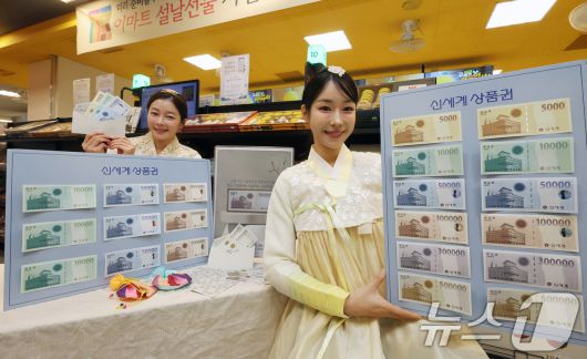 (서울=뉴스1) 황기선 기자 = 14일 오전 서울 용산구 이마트 용산점에서 모델들이 설을 앞두고 신세계상품권을 소개하고 있다. 신세계상품권은 전국 이마트 및 트레이더스 매장에서 5천원부터 50만원까지 다양한 금액대의 상품권을 만나볼 수 있다. 2026.1.14/뉴스1