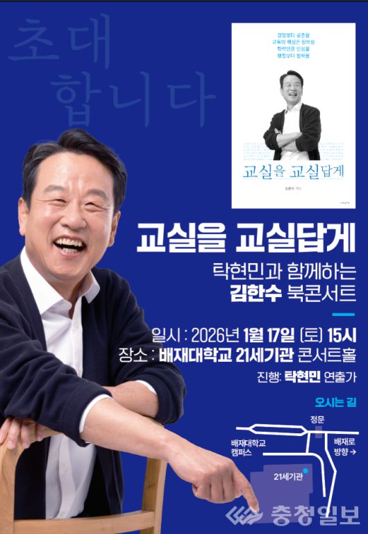 김한수 전 배재대학교 부총장의 신간 '교실을 교실답게' 출간을 계기로 한 북콘서트가 오는 17일 오후 3시, 배재대학교 21세기관 콘서트홀에서 열린다. 행사는 '교실을 교실답게'를 주제로, 탁현민 교수의 진행 아래 라운드형 토크쇼 방식으로 진행된다.