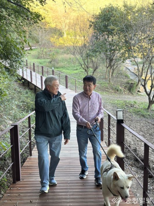 왼쪽부터 문재인 전 대통령과 김한수 전 부총장이 산책로를 함께 걷고 있는 모습 |