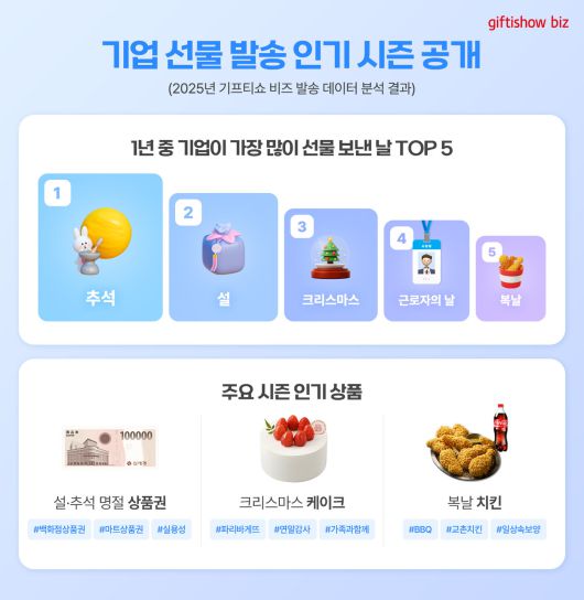 5위에는 복날이 이름을 올렸다. 대표적인 복날 선물로 손꼽히는 치킨이 인기를 끌었으며, 무더운 여름철 임직원 격려와 복날 연계 이벤트 경품으로 주로 활용된 것으로 분석된다.