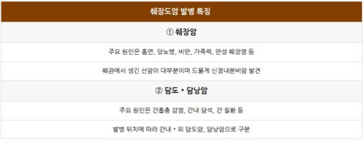 ’담도‧담낭암'은 위치에 따라서 △간내담도암 △간외담도암 △담낭암으로 구분합니다. 담도‧담낭암 발생에 영향을 주는 요인은 담석증과 담도염 외에, 간경변 및 B·C형 간염 등 간 질환과 밀접한 관련이 있습니다.