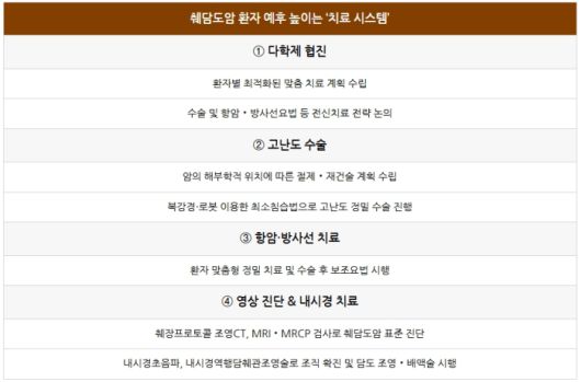이처럼 통합적인 치료 접근은 췌담도암 환자의 장기 생존에 매우 중요해서 ’다학제 협진'이 필수입니다. 췌담도암 치료를 위해서 △외과 △소화기내과 △영상의학과 △방사선종양학과 △종양혈액내과 교수진이 긴밀하게 협력하는 이유입니다.