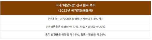 2022년 국가암등록통계에 따르면 1년간 새로운 췌담도암 환자는 약 1만7000명 발생했습니다. 특히 췌장암의 5년 생존율은 약 17%, 담낭‧담도암은 약 29%에 그칩니다. 전체 암 평균 5년 생존율인 약 73%에 크게 못 미칩니다.