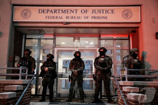 미국의 베네수엘라 공습과 니콜라스 마두로 부부 체포 후에 3일(현지시간) 미 법무부 소속 연방 요원들이 브루클린 연방 구치소(MDC 브루클린) 옆 법무부 건물 밖에서 경계를 서고 있다. 마두로 대통령은 이 구치소에 수감돼 있다. 2025.01.03 ⓒ 로이터=뉴스1 ⓒ News1 최종일 선임기자 |