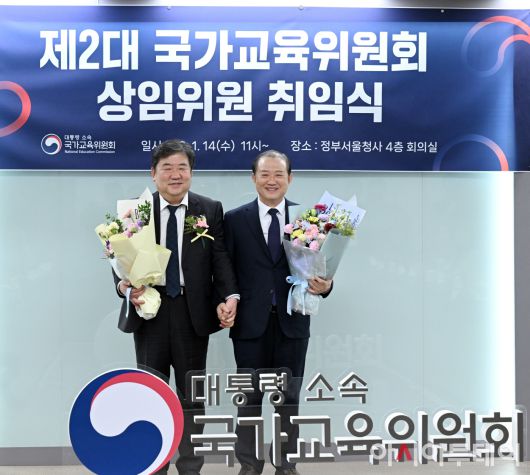 아시아투데이 박성일 기자 = 이광호, 김경회 국가교육위원회 상임위원이 13일 오전 서울 종로구 정부서울청사에서 열린 제2대 국가교육위원회 상임위원 취임식을 마치고 기념촬영을 하고 있다. ⓒ "젊은 파워, 모바일 넘버원 아시아투데이"