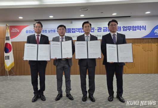 김태흠 지사는 14일 도청 상황실에서 오주현 NH농협은행 충남본부장, 윤석용 한국외식업중앙회 충남도지회장, 조소행 충남신용보증재단 이사장과 식품접객업소 민관 금융 지원 업무협약을 체결했다.
