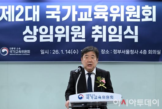 아시아투데이 박성일 기자 = 이광호 국가교육위원회 상임위원이 13일 오전 서울 종로구 정부서울청사에서 열린 제2대 국가교육위원회 상임위원 취임식에서 취임사를 하고 있다.