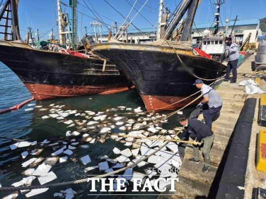 여수해양경찰서가 지난해 6월 여수 국동항에서 발생한 해양오염 사고 현장에서 방제작업을 벌이고 있다. /여수해양경찰서 |