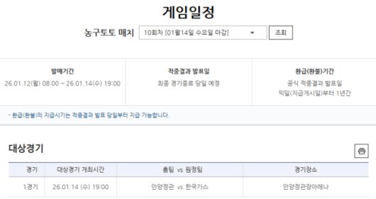 서울올림픽기념국민체육진흥공단(이사장 하형주)이 발행하는 체육진흥투표권 스포츠토토의 수탁사업자 한국스포츠레저㈜가 오는 14일(수) 오후 7시에 안양정관장아레나에서 열리는 2025-2026시즌 국내남자프로농구(KBL) 안양 정관장-대구 한국가스공사(원정)전을 대상으로 하는 농구토토 매치 10회차의 마감이 임박했다고 밝혔다.