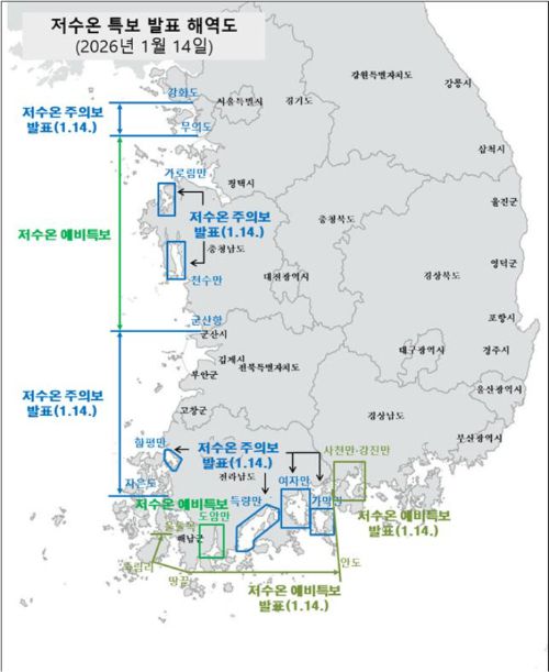 경상남도는 최근 이어진 한파로 해역 수온이 급격히 하강함에 따라 14일 오전 10시부터 사천만과 강진만 해역에 저수온 예비특보가 내려졌다고 밝혔다.