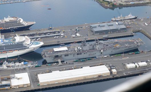 중국 요원에게 1700만 원을 받고 군사기밀을 넘긴 미 해군 수병이 징역 16년 8개월의 중형을 선고받았다. 이 사건은 최근 징역 5년이 선고된 한국 현역병의 기밀 유출 사건과 수법 및 대가 면에서 흡사하지만, 처벌 수위는 3배 이상 차이가 났다. 사진은 2014년경 시애틀 도심 인근 부두에 상륙한 미 해군 강습상륙함 에섹스함(USS Essex)의 모습. AP/뉴시스 |