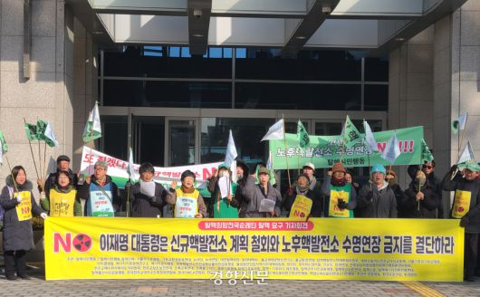 전국 41개 시민사회단체로 구성된 ‘탈핵시민행동’은 14일 전북도청 앞에서 기자회견을 열고 “정부는 신규 핵발전소 건설 계획을 전면 폐기하고 소형모듈원전(SMR) 추진과 노후 원전 수명연장을 즉각 중단하라”고 촉구했다.