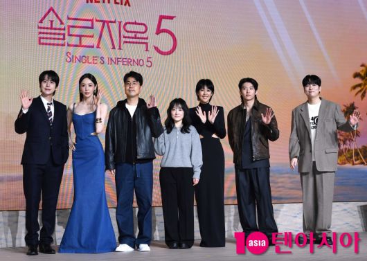[텐아시아=조준원 기자]김재원 PD, 홍진경, 이다희, 규현, 한해, 덱스, 박수지 PD가 14일 서울 마포구 호텔 나루 서울 엠갤러리에서 열린 넷플릭스 예능 <솔로지옥> 시즌5 제작발표회에 참석하고 있다.