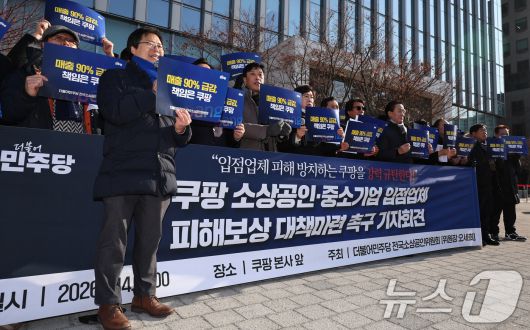 (서울=뉴스1) 구윤성 기자 = 오세희 위원장을 비롯한 더불어민주당 전국소상공인위원들이 14일 오전 서울 송파구 쿠팡 본사 앞에서 기자회견을 열고, 쿠팡 이용자 이탈과 주문 감소 등으로 인한 입점업체의 피해 보상을 촉구하고 있다. 2026.1.14/뉴스1