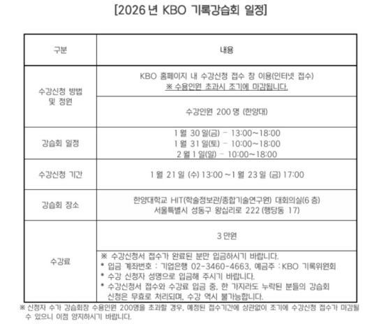 [서울=뉴스핌] 김용석 기자 = 2026년 KBO 기록강습회가 30일부터 2월1일까지 서울 한양대학교에서 열린다. 기록강습회는 야구 공식기록법의 보급과 이해를 통한 저변 확대를 목적으로 프로야구 원년인 1982년부터 개최됐다.