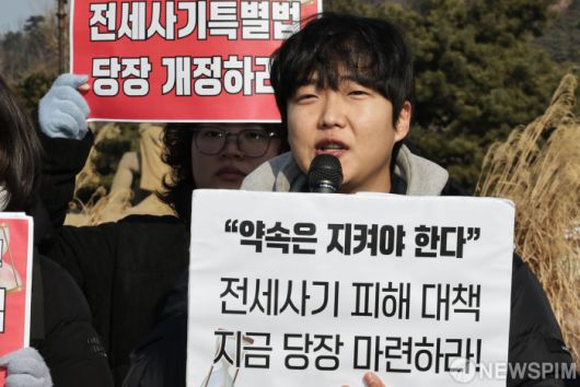 [서울=뉴스핌] 양윤모 기자 = 전세사기·깡통전세 피해자 전국대책위원회가 14일 오전 청와대 분수대앞에서 이재명 대통령이 약속하고 지시한 전세사기 대책 이행을 촉구하는 기자회견을 개최했다. 2026.01.14 yym58@newspim.com