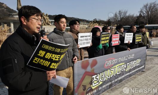 [서울=뉴스핌] 양윤모 기자 = 전세사기·깡통전세 피해자 전국대책위원회가 14일 오전 청와대 분수대앞에서 이재명 대통령이 약속하고 지시한 전세사기 대책 이행을 촉구하는 기자회견을 개최했다. 2026.01.14 yym58@newspim.com