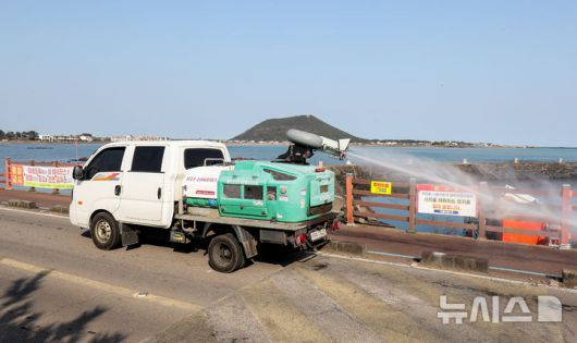 [서귀포=뉴시스] 우장호 기자 = 14일 오전 제주 서귀포시 청정축산과 소속 방역 차량이 야생 조류 분변에서 고병원성 조류인플루엔자(AI) 바이러스가 검출된 시흥리 해안가에서 소독약을 살포하고 있다. 제주도는 서귀포시 성산읍 시흥리 해안에서 조류인플루엔자가 확인됨에 따라 반경 10㎞ 이내 가금류 사육 농가에 이동 제한 조치도 내린 상태다. 2026.01.14. woo1223@newsis.com |