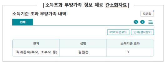 근로자가 소득기준을 초과한 부양가족을 잘못 공제받는 일이 없도록 소득금액 100만원(근로소득만 있는 경우 총급여 500만원)을 초과하는 부양가족에 대한 정보를 연말정산 간소화 서비스 자료조회 화면에서 안내한다.