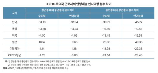 문제는 연령에 따른 하락 속도다. 보고서는 한국 근로자의 인지역량 감소가 20~30대부터 시작되고, 50대 이후 급격히 가속화되는 점을 핵심 특징으로 지목했다. 2주기 조사 기준으로 25~29세 대비 40~44세 근로자의 수리력은 14.1점, 언어능력은 18.9점 낮아졌는데, 이는 독일·미국·일본 등 주요 선진국보다 감소 폭이 크다.