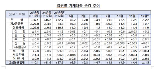14일 금융위원회가 발표한 '2025년 가계대출 동향(잠정)에 따르면 지난해 전(全) 금융권 가계대출은 총 37조6000억원 증가해 전년(41조6000억원) 대비 증가폭이 축소된 것으로 집계됐다.