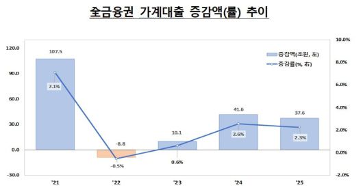 제2금융권 가계대출의 경우 여신전문금융업(3조원), 보험업(1조8000억원), 저축은행업(8000억원) 등이 모두 감소했다. 반면 상호금융권의 경우 10조5000억원이 늘었다. 새마을금고 가계대출이 5조3000억원 증가해 상호금융권 가계대출 증가세를 견인했다.