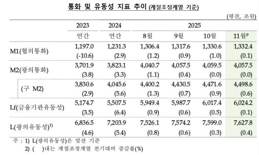 한편 협의통화(M1) 평잔은 1332조4000억원으로 전년 동월 대비 6.9% 증가했다. 증가 폭은 전월(+7.8%)보다 축소됐다. 금융기관 유동성은 6024조2000억원으로 같은 기간 6.9% 늘었다. 광의유동성은 7627조8000억원으로 6.8% 증가했다.