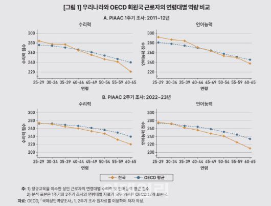 보고서는 OECD가 약 10주년 주기로 실시하는 ‘국제성인역량조사’ 결과를 바탕으로 작성됐다. 수리력과 언어능력으로 대표되는 인지역량 조사는 2011~2011년, 2022~2023년에 각각 한차례씩 이뤄졌다.