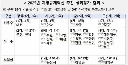 행정안전부는 '2025년도 지방규제혁신 추진 성과평가'를 실시해 우수한 성과를 거둔 지방정부 24곳(광역 3곳, 기초 21곳)을 선정했다고 14일 밝혔다.
