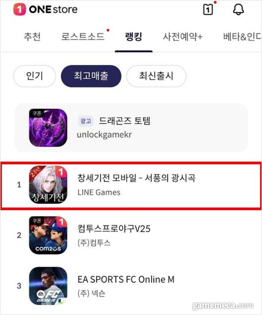 ▲ 원스토어 매출 1위를 기록한 창세기전 모바일: 아수라 프로젝트 (사진제공: 라인게임즈) |