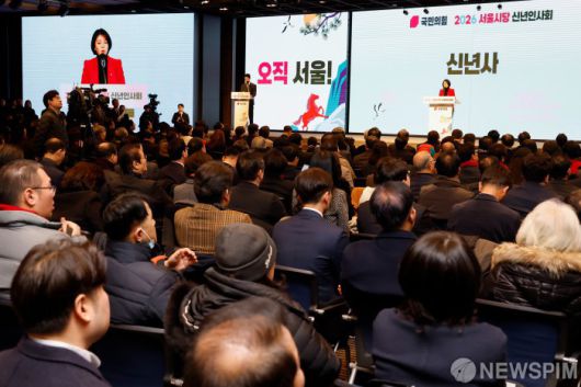 [서울=뉴스핌] 류기찬 기자 = 배현진 국민의힘 서울특별시당 위원장이 14일 오전 서울 여의도 중소기업중앙회 KBIZ홀에서 열린 2026 국민의힘 서울시당 신년인사회에서 신년사를 하고 있다. 2026.01.14 ryuchan0925@newspim.com