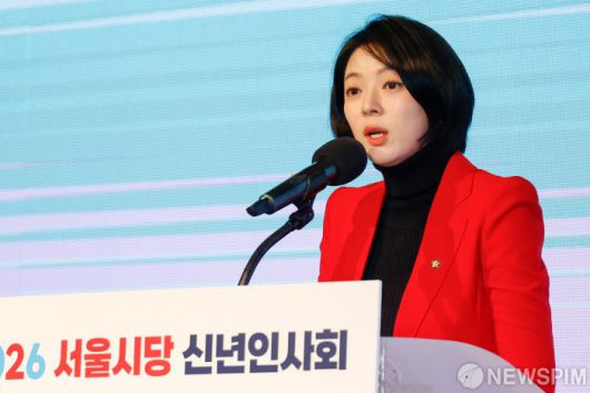 [서울=뉴스핌] 류기찬 기자 = 배현진 국민의힘 서울특별시당 위원장이 14일 오전 서울 여의도 중소기업중앙회 KBIZ홀에서 열린 2026 국민의힘 서울시당 신년인사회에서 신년사를 하고 있다. 2026.01.14 ryuchan0925@newspim.com