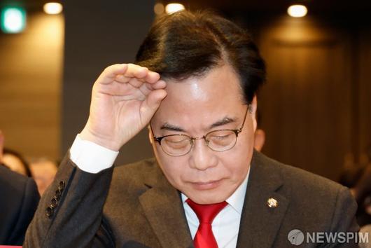 [서울=뉴스핌] 류기찬 기자 = 송언석 국민의힘 원내대표가 14일 오전 서울 여의도 중소기업중앙회 KBIZ홀에서 열린 2026 국민의힘 서울시당 신년인사회에서 땀을 닦고 있다. 2026.01.14 ryuchan0925@newspim.com