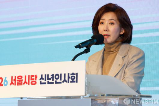 [서울=뉴스핌] 류기찬 기자 = 나경원 국민의힘 의원이 14일 오전 서울 여의도 중소기업중앙회 KBIZ홀에서 열린 2026 국민의힘 서울시당 신년인사회에서 신년사를 하고 있다. 2026.01.14 ryuchan0925@newspim.com