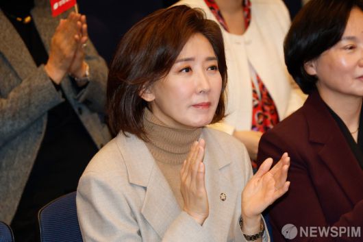 [서울=뉴스핌] 류기찬 기자 = 나경원 국민의힘 의원이 14일 오전 서울 여의도 중소기업중앙회 KBIZ홀에서 열린 2026 국민의힘 서울시당 신년인사회에서 박수를 치고 있다. 2026.01.14 ryuchan0925@newspim.com