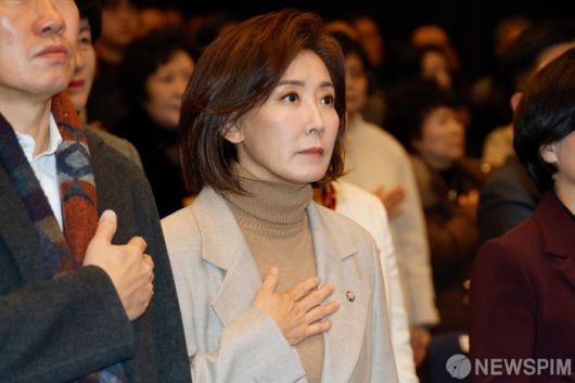 [서울=뉴스핌] 류기찬 기자 = 나경원 국민의힘 의원이 14일 오전 서울 여의도 중소기업중앙회 KBIZ홀에서 열린 2026 국민의힘 서울시당 신년인사회에서 국민의례를 하고 있다. 2026.01.14 ryuchan0925@newspim.com