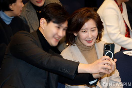[서울=뉴스핌] 류기찬 기자 = 나경원 국민의힘 의원이 14일 오전 서울 여의도 중소기업중앙회 KBIZ홀에서 열린 2026 국민의힘 서울시당 신년인사회에서 당원과 기념 촬영을 하고 있다. 2026.01.14 ryuchan0925@newspim.com