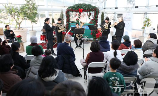 (수원=뉴스1) 김영운 기자 = 14일 경기 수원시 장안구 일월수목원 전시온실에서 열린 올해 첫 수원수목원 가든음악회, 수원시립교향악단 아트인사이드 '선율'에서 시민들이 수원시립교향악단의 연주를 감상하고 있다. 2026.1.14/뉴스1